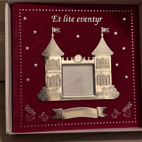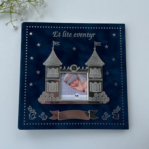 Et lite eventyr scrapbook i tinn og mørk blå velur, følger barnet fra barsel til ca. 3 år, god plass til notater og bilder.