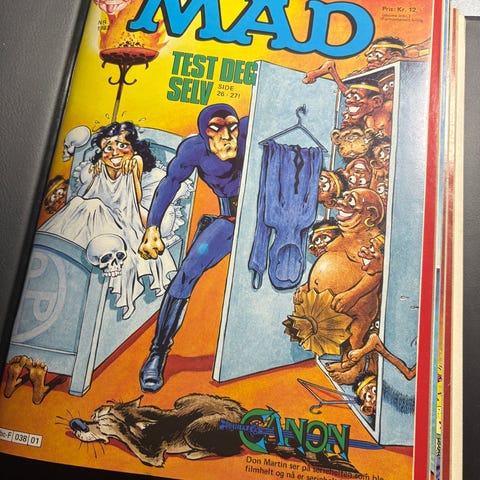 10stk permer med klassisk MAD! 6 permer med norsk MAD, ellers US, dansk og tysk. Følger ellers med noen postere, noen hefter Cracked og et par ekstra ikke-norske MAD. Stort sett fin stand. Selges samlet, åpen for bud over 1800,- pluss evt frakt. k114