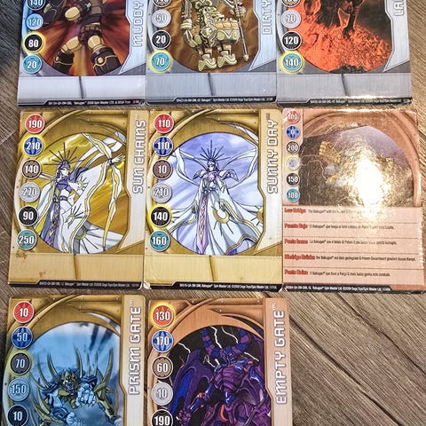 Bakugan kort. Brukt og delvis synlig brukt? men vil si de fleste er i god stand. 31 kort, 27 magnetiske, 4 ikke magnetiske.