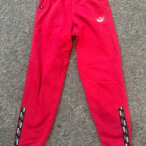 Puma joggebukse i størrelse 164 for jenter. Buksen er rød og laget i komfortabelt materiale. Passer til hverdagsbruk og fritidsaktiviteter. Det er ingen skader eller hull på buksene.