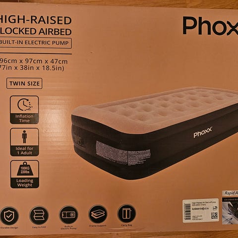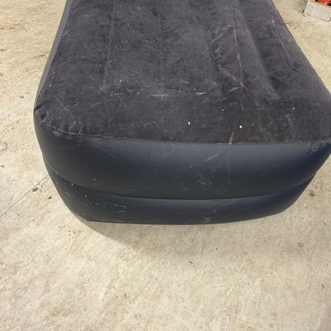 Oppblåsbar madrass med automatisk pumpe som fyller opp luft og tømmer ut luften etter bruk. Kun brukt et par ganger. har ikke målene på madrassen, men det er enkel madrass (ca 90 cm/200cm)