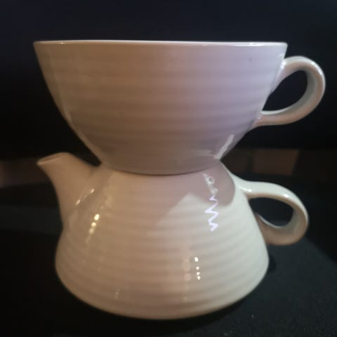 Disse ble kjøpt til 1049kr for kaffe/tekannen og 1049kr for 4 glass/kopper, dvs totalt for 2.100kr, men selges nå samlet til 1.000 kr fordi jeg har noen lignende som jeg har fått i gave og trenger dermed ikke flere.