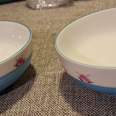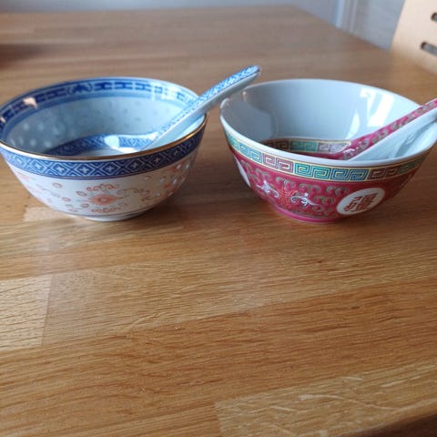 2 stk. skåler og 2 stk. spader. Selges samlet. Kjøpt på reise i Japan i 2008. Aldri brukt, så de er uten feil, mangler eller slitasje. Egnet for suppe.