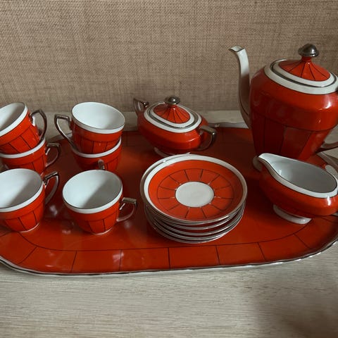 Nydelig servise i lyseblått, 8 kopper med skåler, kanne, fløtemugge, sukkerskål og brett.