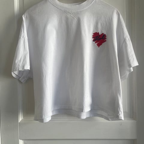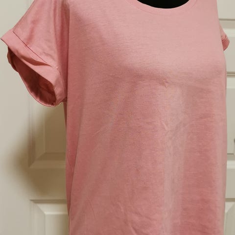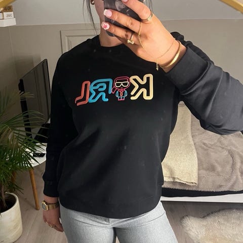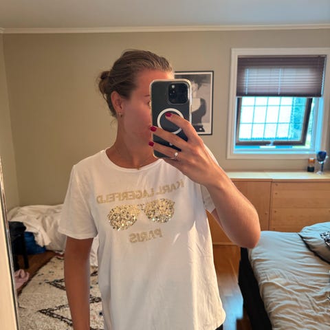Karl Lagerfeld T-skjorte i størrelse L for dame. T-skjorten er rosa og har et tekst i bling forsiden. Egnet for daglig bruk eller som en del av en mer uformell stil.