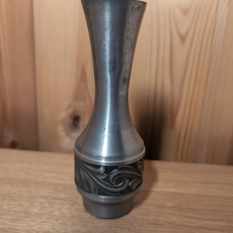 Vi har fått inn for salg en tinn vase / lysestake Ø 7.5 H 18 cm.