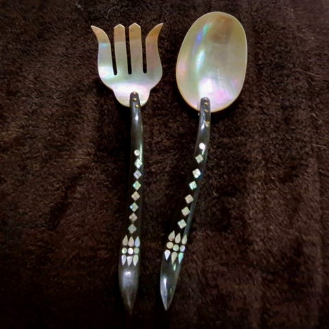 Et nydelig salatbestikk med det som ser ut som perlemor på skaftet/ ben