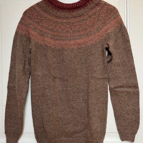 Ny, hjemmestrikket Mariusgenser størrelse ca. 4-6 år. Rød med hvitt og blått mønster.