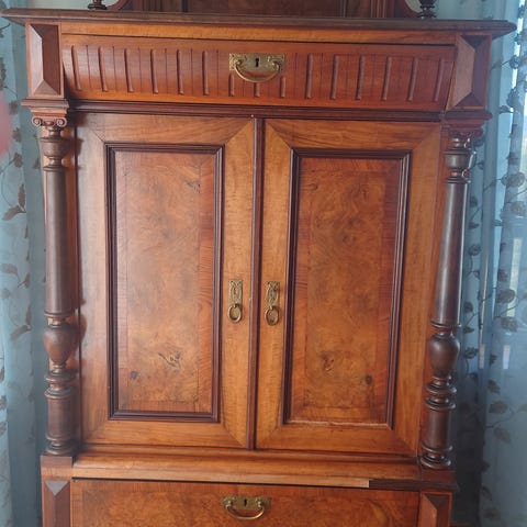 Flott antikk skap med utskjæringer i tre selges. To sprekker på toppen (se bilder) . Følger med nøkkel, men skapet er vanskelig å låse. To skuffer øverst, sokkel i bunnen.