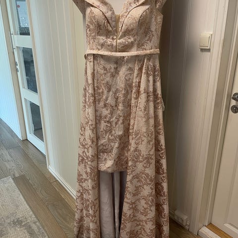 Dette er en helt unik kjole fra merket Lenovia USA. Kjøpt i Bogstadveien,Oslo. Denne kjolen brukte jeg i bryllupet da søsteren min giftet seg. Den har et så nydelig fargespill som er nesten umulig å forklare. Den skifter farge fra dyp champagne farge til gullfarge! Den er sydd opp så den vil passe en person mellom 1.55- 165 cm som bruker høye heler. Jeg har aldri sett noen lignende kjole senere i mitt liv og jeg vil si at denne er helt unik. Stener er sydd på toppen og nedover kjolen. Korsett lignende overdel. Kjolen har glidelås på siden. Den er litt krøllete siden den har vært lagret. Men det retter seg fint ut når den får henge litt eller blir dampet! Den har under-skjørt og strutteskjørt så den faller meget pent. kjolen er kun brukt av meg i noen få timer i kirken da jeg var forlover i et bryllup. Fantastisk spill i fargene på denne kjolen!