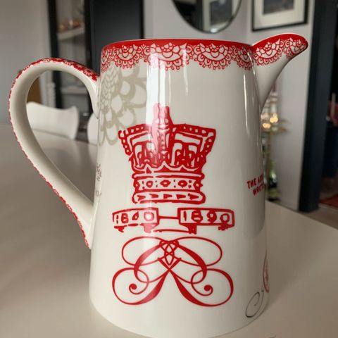 15 cm høy, 23,5 cm fra hank til tupp, rommer 1 liter