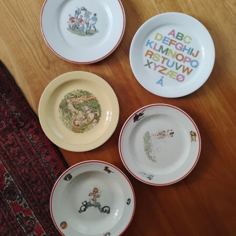 Selger div barnetallerknet samt en Freia tallerken. Alle er fint brukte og et par er ubrukte. Selges for 200kr stk. Freia tallerken er solgt.