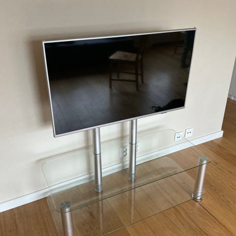 Pent brukt TV-benk i glass med påmontert feste for TV selges til en rimelig pris. TV-benken er solid bygget og veier noen kilo.