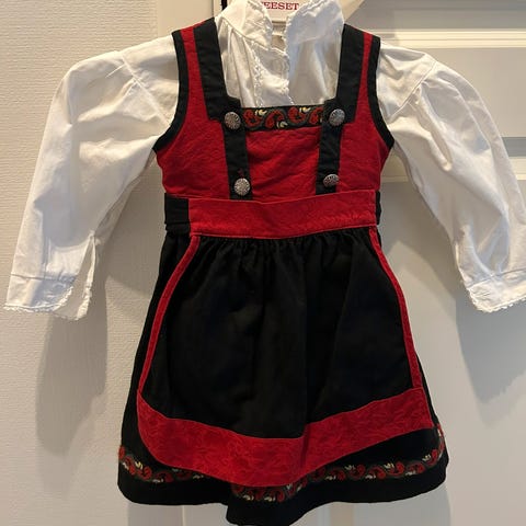 Festdrakt Merke Aurora størrelse 62. Lende 51 cm. Bredde 25 cm. Bluse tilhøre ikke til festdrakt. Bluse er jente model Merke Mexx. Størrelse 12- 18 monter . Selger separat hvis dere ønskekt