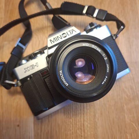 Selger Minolta xg-1 med flott 50mm objektiv fra Minolta med 1:2. Det følger med bruksanvisning for kamera og objektiv og en godt slitt veske. Dette er et utrolig fint analog kamera som tar nydelige bilder. Har et tele objektiv som ligger på egen annonse.