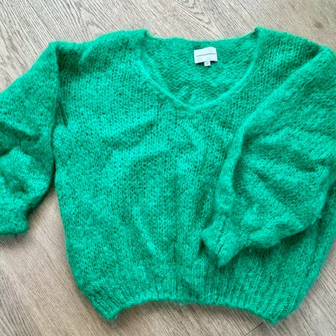 American Dreams genser for dame i størrelse M. Genseren er blå og har en myk, lodden strikkestruktur. Passer godt til hverdagsbruk og kan kombineres med både bukser og skjørt for et enkelt og behagelig antrekk.