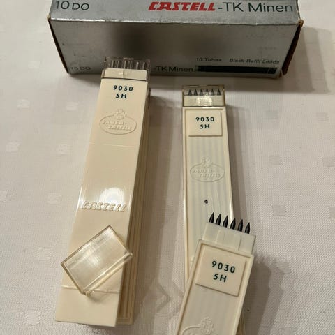 Se lenke for blyanter og pris uten pleksiglass. Blyantene som selges er en eldre utgave og ikke kantete i formen, samt penere font på blyantene.