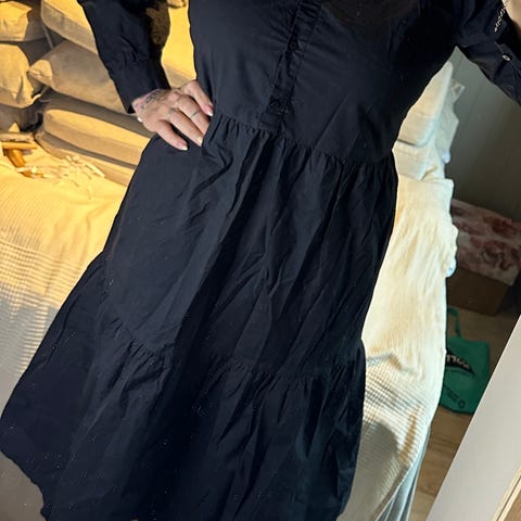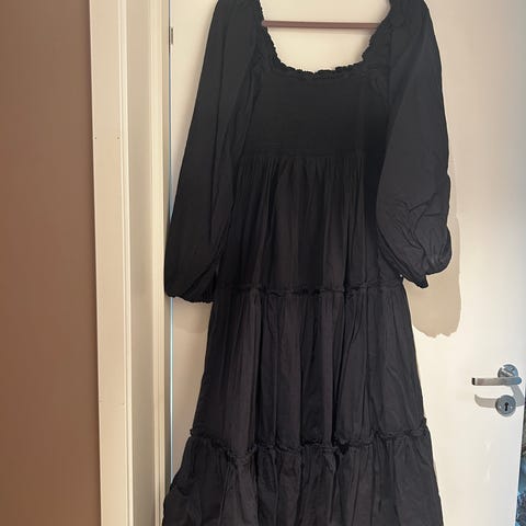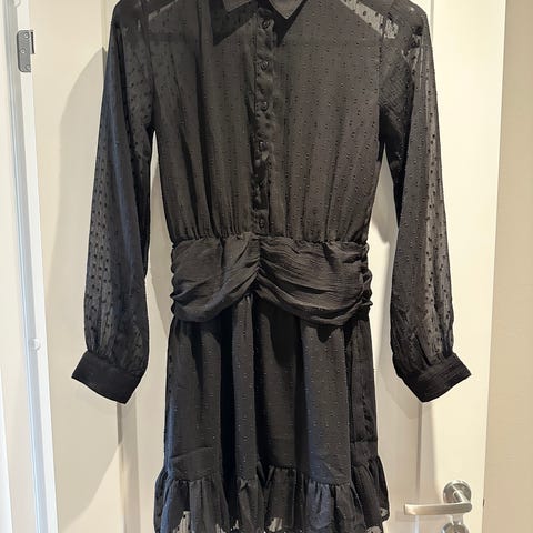 NA-KD kjole i størrelse XS for. Kjolen er svart og har lange ermer med detaljer på skuldrene. Materialet gir et komfortabelt og stilrent utseende, egnet for ulike anledninger.