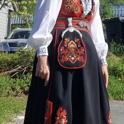 Håndhevet forklebånd til Vest Telemarks bunad. Vevet på grindvev ca 1970, meget pent, lite brukt. 3 m langt, 2,2 cm bredt. Selges høystbydende over kr 3700.