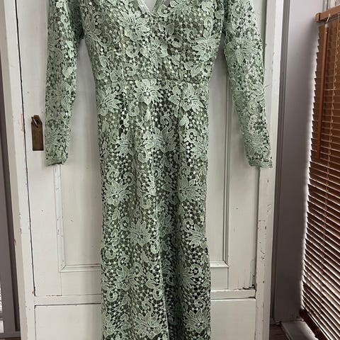 Nydelig selskapskjole, kjøpt i 2002 på Modell Pels/ i Kristiansand. Brukt en gang, gjest i bryllup. Meget god kvalitet og har et nydelig snitt. En eksklusiv form og farge, rose-sjatteringer i dyp grønn/ asurblå. Tverrsnitt rett over livet, målte 40 cm og skrår vidt utover. Lenge målt fra skuldrene til kjole kanten er 140 cm. Tenker str 36 dekker, str. S. Be om flere bilder, jeg sender gjerne. Seriøse lavere bud vurderes , men kjolen er verdt prisen. Kan levere nærme Søgne.