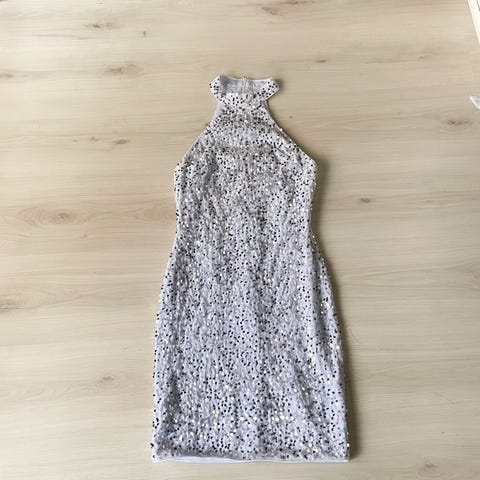 Paljettkjole med sydd omslagsdel i front og lang pufferm med vidde og elastikk nederst. Kjolen har elastikk i livet og skjørt med litt vidde og lengde ca til leggen. Modellen er 180cm og har på seg str 36.