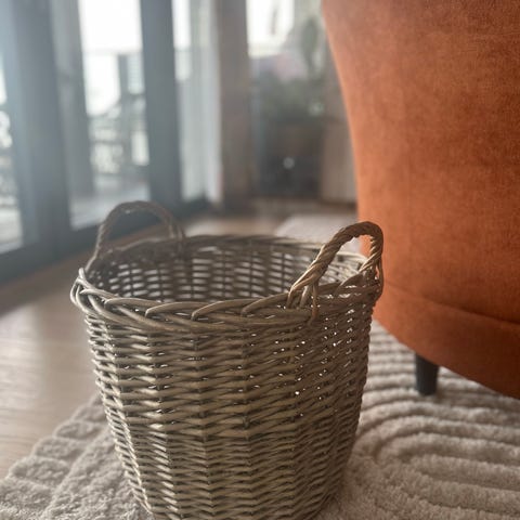 Flettet kurv med håndtak. Fin å bruke til f.eks. oppbevaring av ved (egner seg ikke til bæring) eller aviser/blader. Høyde (uten hank) 35 cm, bredde 33 cm, dybde 49 cm.