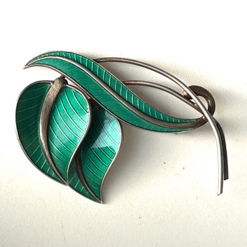 Elegant vintage brosje i sterling sølv med grønn emalje – Albert Scharning