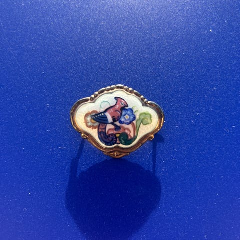 Selger en vakker brosje fra den anerkjente gullsmeden Albert Scharning (1878–1960), en av Norges mest kjente produsenter av emaljesmykker på 1900-tallet. Brosjen er stemplet A. Sch, Norway, Sterling 925S, som bekrefter både opprinnelse og sølvinnhold.