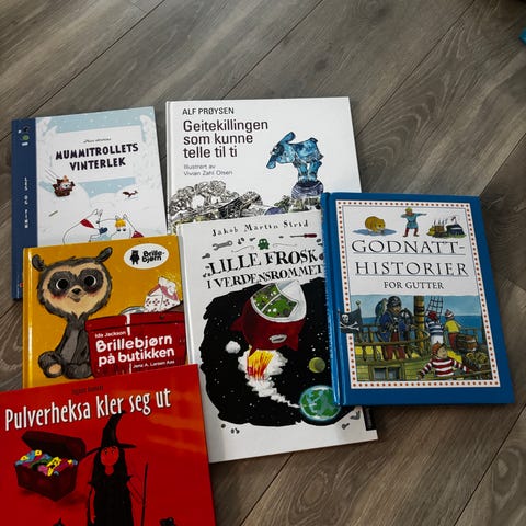 Vi er besteforeldre som har hatt flere barnebarn mye på besøk. Nå har de blitt større og vi selger 16 bøker som har vært veldig populære og morsomme. Kr 20- 30 pr. stk.