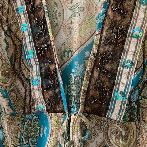 Fint og original kjøle med fine farger på. Den har stretch så den legger seg fint på kroppen.