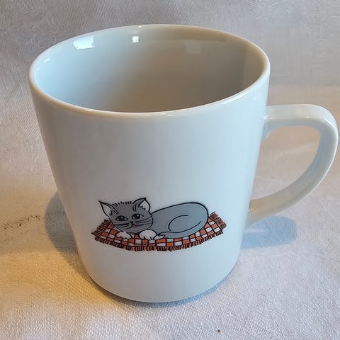 Hel og pen kopp med kattemotiv. Kopp fra 70-80-tallet. Har de siste 20 årene bare stått i skapet og da er det greit at den går videre til noen andre.