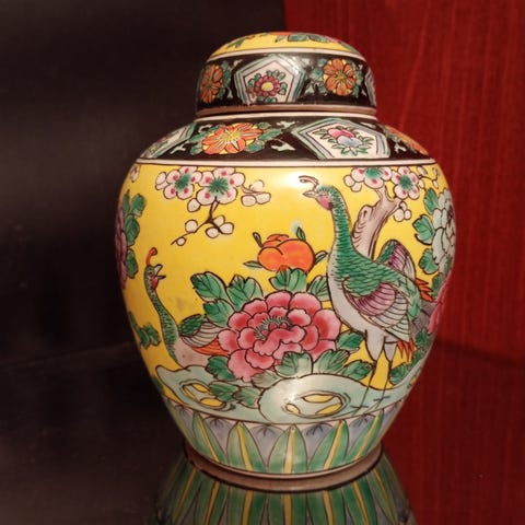 Rødglassert gammel stake med gul dekor.