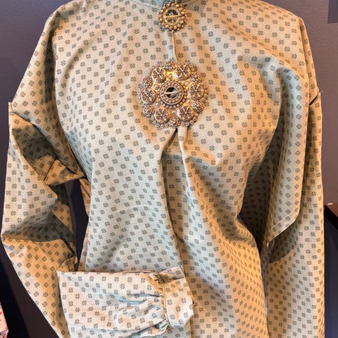 Lekker bunad skjorte. Passer fint inn i en beltestakk eller en festdrakt. Den har rynker både øverst og nederst på erme. Str M, stor i størrelsen.