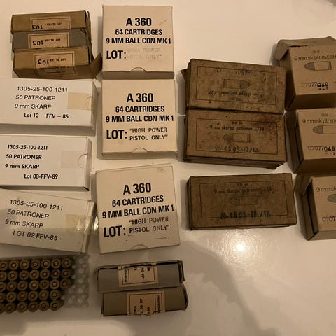 9mm patroner fra Raufoss laget i 1952/1955. Er merket med patroner for pistol og MP, regner med at de kan være hardt ladet. Patronene er gamle og egner seg vel best som samlerpatroner. Kommer i esker på 16 patroner, selger kun fulle esker. Kopi av våpenkort og ID eller samlertillatelse fra Politiet kreves.