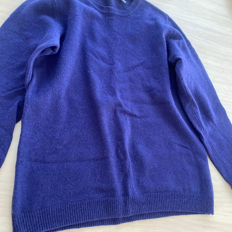 100% ullgenser fra Blu, str.M, klarblå farge, brukt og noe tovet under armer (se bilder) ellers tykk og varm genser. Nypris på Vic var 1200 kr.