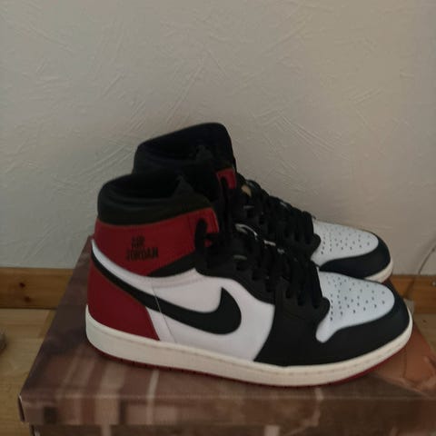 Nike Jordan High hvit/svart/gul, med skumgummi materiale øverst (som gir en ytterligere off-white fargenyanse) og i pløsen