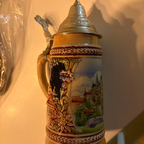 Ølkrus med vakkert mønster og lokk for bedre ølsmak.Høyde 22cm,bredde 10cm.Ser bra ut i sin naturlige form.