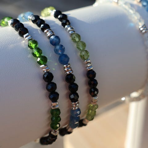 To magnetiske halskjeder, som også kan brukes som armbånd eller klave. Det ene har sorte, hvite og lys blå perler og det andre har sorte, hvite og rosa perler. De sorte perlene er magnetiske og fester seg til hverandre, slik at du slipper fikling med låsmekanismer. De kan sendes. Kr.150 pr.stk.