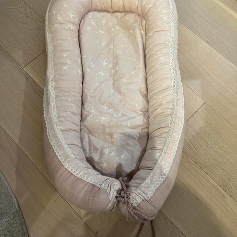 Voksi babynest selges da baby har blitt for stor til det. Dette har vi vært kjempe fornøyd med. Har kun hatt det liggende i stuen og har alltid hatt teppe i nestet. Aldri hatt noen uhell i og trekket er nyvasket.