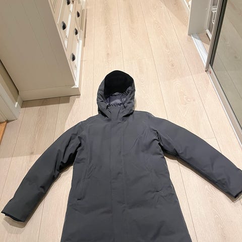 Meget pent brukt. Mørk blå dunparkas som rekker meg midt på låret (jeg er 178cm). God og fluffy dun, materoale som tåler litt og samtidig tåler litt lett regn/vind