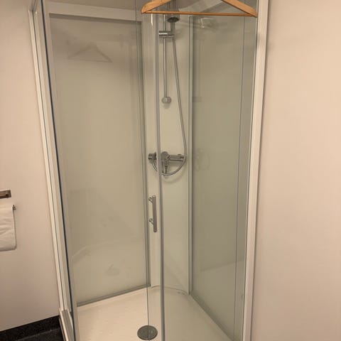 Selge veggmontert blandebatteri med stor dusjhode 40x40 cm med hand dusj og slange. Fungerer helt fint.