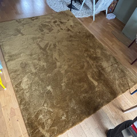 Pent brukt gulv matte selges for 200kr. Handlaget i India. Noen bruksmerker. Mål er 3 x 2 meter. Grå/gråmelert. Farven endrer seg etter hvor en stryker over stoffet. Merke Lindø fra Skeidar. Ny pris 6990kr. Rengjort og luftet. Treng mulig en rens
