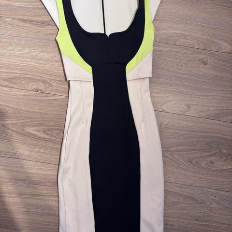 Smart kontor/finkjole, coctailkjole med fin detalj på skulder selges. Går til ca midt på kneet (på meg som er 170). Mørkeblått skjørt nederst, gul, rosa og hvit oppe. Selges. Nyrenset. Ingen feil eller skader. Usynlig glidelås bak. Nypris 3000.Kan hentes i Bergen eller sendes.