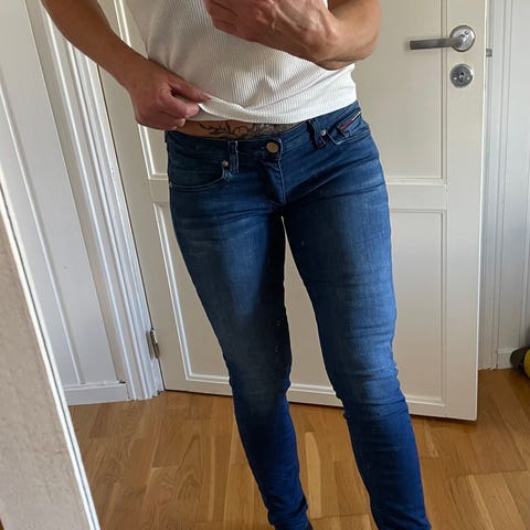 Jeansbukse med hull over øvre og nedre lår. Fra merket Noisy May.