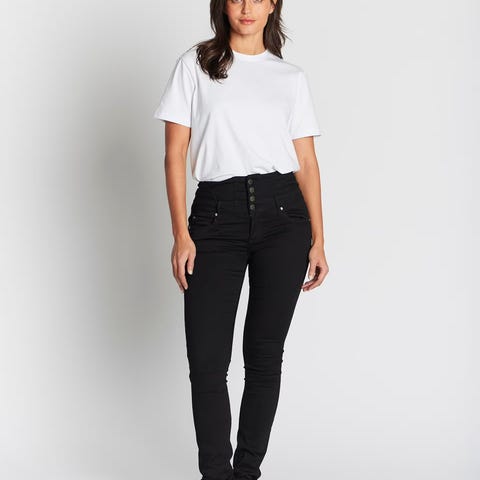 «Bukse i et superstretchy stoff med en glatt overflate. Den har ekstra høyt liv med 4 knapper og en smal passform. Baklommene er plassert midt på rumpa.
