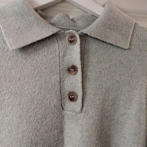 Ribbestrikket genser i kjempefin olivengrønn/mosegrønn og båthals. Splitt i ermene. Denne er superfin men dessverre litt for stor for meg. Str XL, og er veldig stretchy og fin. Fargen er som mitt bilde (bilde 1), mens passformen er vist i de andre bildene.