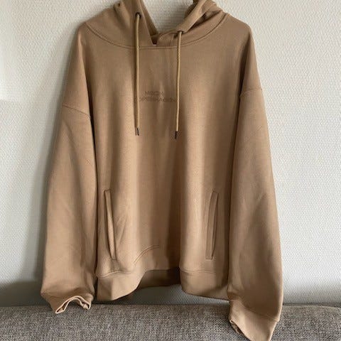 Pent brukt hettegenser i brun, størrelse L fra Moss Copenhagen. Logo på brystet og lommer framme.