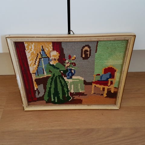 Har slike tyoer av sydd bilde m/ svart ramme blir vare liggende.