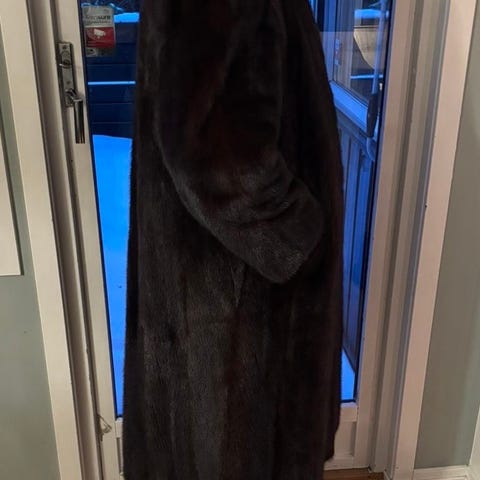 Pen innsvinget pelskåpe. Kan brukes med eller uten belte. Str 36-38