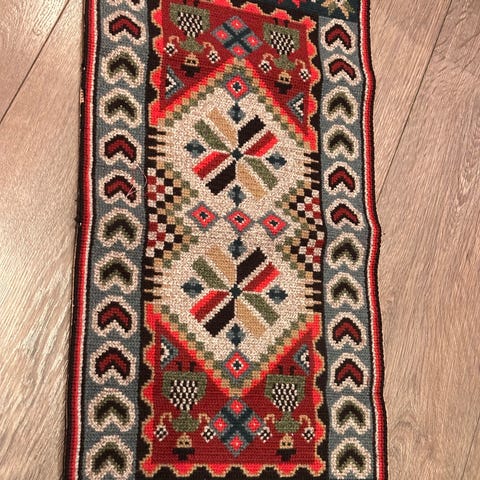 Eldre vevet duk i flotte klare farger. Kan også brukes som et lite veggteppe.